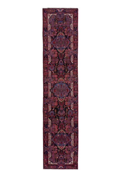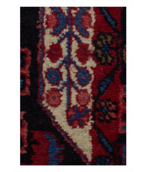 Tapete oriental estilo clássico. Com tonalidade predominante vermelho e detalhes em azul e preto. Ideal para uso em ambientes como corredores.